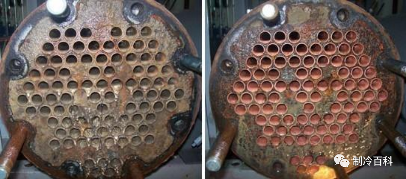 1、由于水中鈣、鎂、鹽類物質(zhì)的存在,空調(diào)水系統(tǒng)不可避免的會(huì)結(jié)生各種水垢,因水垢的導(dǎo)熱系數(shù)是碳鋼的1.11%,油垢、藻類、粘泥的導(dǎo)熱系數(shù)僅是碳鋼的0.23%,當(dāng)空調(diào)水系統(tǒng)結(jié)生污垢后,使機(jī)組傳熱性能惡化,排氣壓力增大,制冷效率下降,從而導(dǎo)致能源浪費(fèi),運(yùn)行維修成本增加,結(jié)垢嚴(yán)重時(shí)還會(huì)使主機(jī)高壓斷開保護(hù),直接影響機(jī)組正常運(yùn)行。