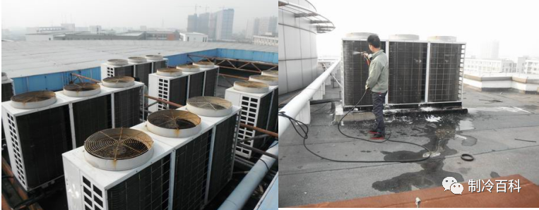 風(fēng)冷主機(jī)清洗:清洗機(jī)水槍調(diào)到水柱狀,對(duì)風(fēng)冷主機(jī)的各部件沖洗一次后,使用專業(yè)的翅片清洗劑均勻噴灑在冷凝器翅片上,等待其反應(yīng),待發(fā)泡后用水槍沖洗,至無殘留物,擦干。