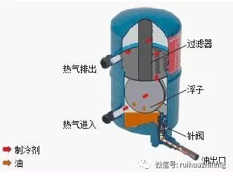 壓縮機(jī)排放的制冷劑熱氣將帶走壓縮機(jī)內(nèi)的油。有時(shí)候量太大,帶走的油不再回到壓縮機(jī)。為了防止這種狀況,我們用油分離器將制冷劑中的油分離出來,使之回到壓縮機(jī)。